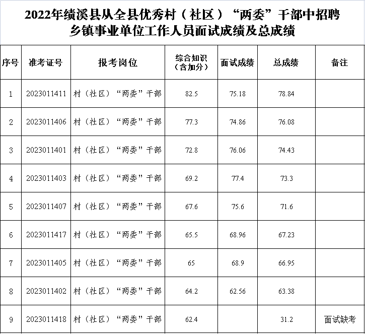 根据《2022年绩溪县从全县优秀村(社区)“两委”干部中招聘乡镇事业单位工作人员公告》,现将2022年绩溪县从全县优秀村(社区)“两委”干部中招聘乡镇事业单位工作人员面试成绩及总成绩予以公布。