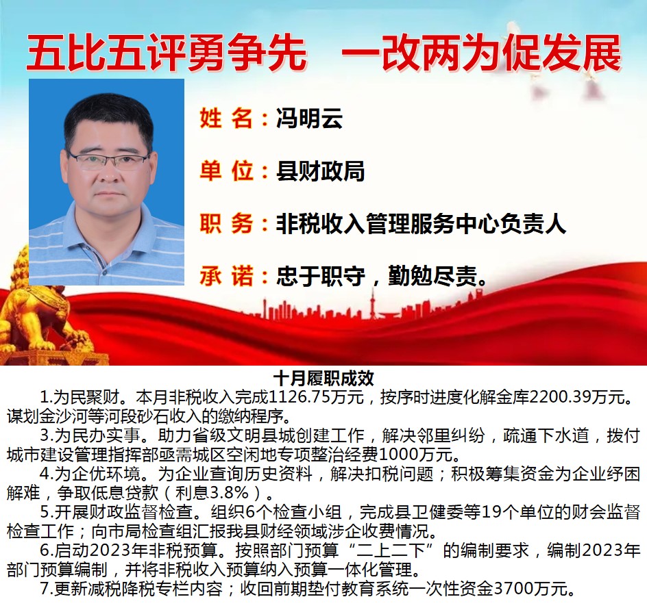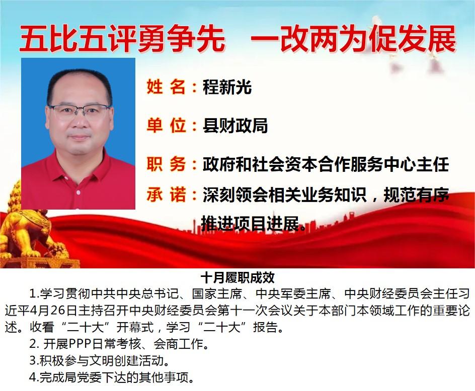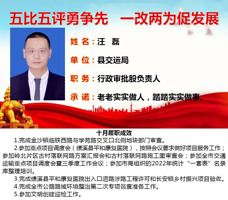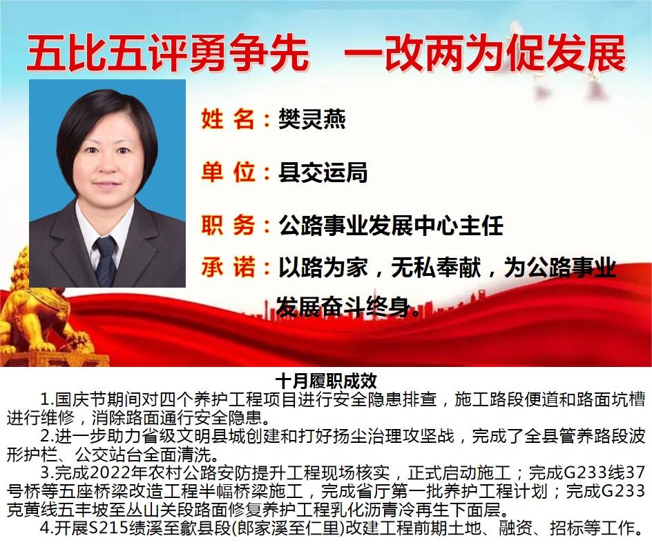 为深入学习贯彻习近平总书记关于作风建设重要论述、落实省委“一改两为五做到”要求,着力解决个别干部作风中“虚、躲、冷、粗、假”等顽瘴痼疾,我县组织开展了县直单位百名股长“五比五评”活动。根据活动《实施方案》要求,现将2022年度100名参评对象10月份履职成效分期进行公示。