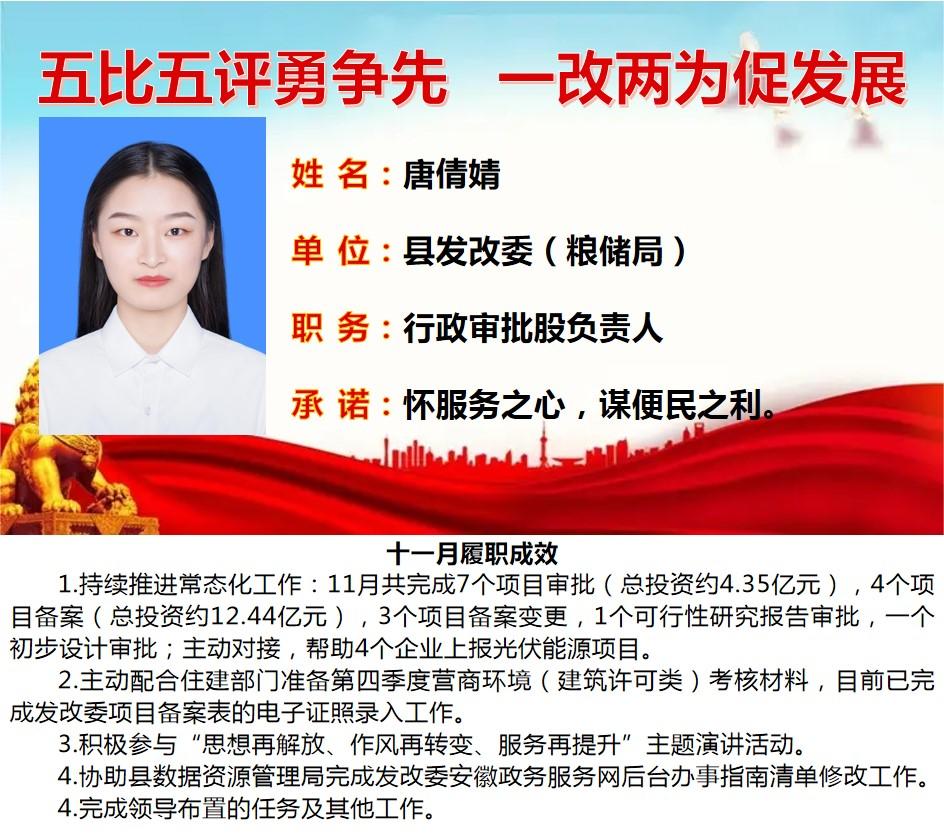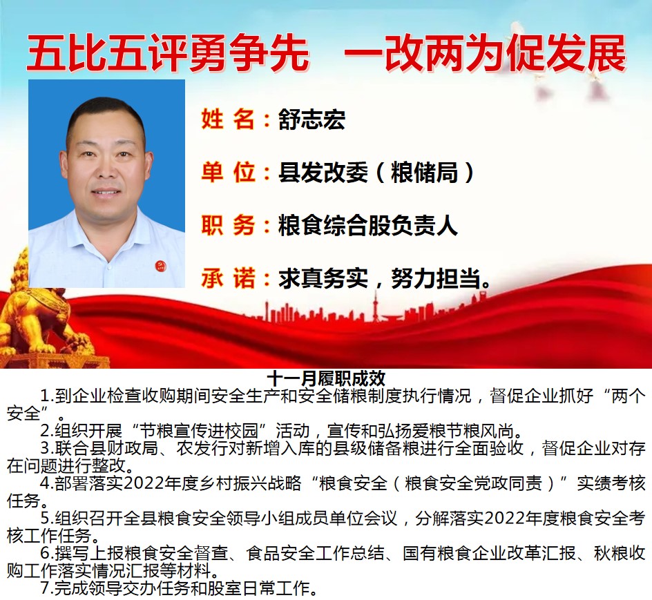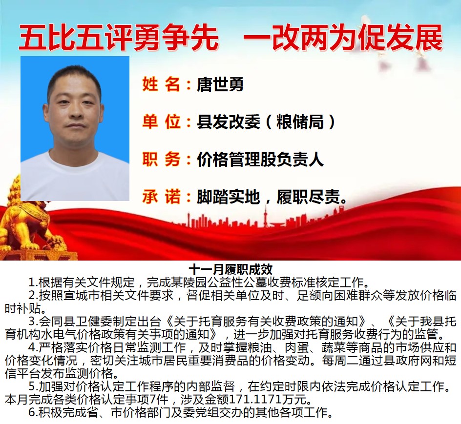 为深入学习贯彻习近平总书记关于作风建设重要论述、落实省委“一改两为五做到”要求,着力解决个别干部作风中“虚、躲、冷、粗、假”等顽瘴痼疾,我县组织开展了县直单位百名股长“五比五评”活动。根据活动《实施方案》要求,现将2022年度100名参评对象11月份履职成效分期进行公示。
