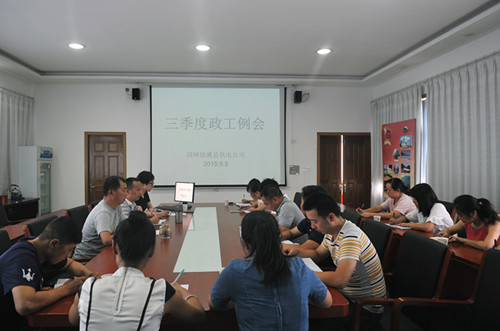 会议学习了习近平总书记系列重要讲话?;嵘希霉镜橙翰慷浴豆ㄏ毓┑绻尽安谎喜皇怠蔽侍馇宓ァ泛徒诟鞑棵?、各通讯员新闻宣传工作完成情况进行了通报;各政工部门、各党支部、团委围绕“三严三实”专题教育、党建项目化管理、青年成长成才、廉政建设等内容进行了发言,畅谈了下阶段的工作具体思路 ;党员服务队就8月份各项工作开展情况及9月份工作计划进行了专题汇报。该公司纪委负责人充分肯定了政工及党支部工作,同时从“虚功实做”方面提出两点要求:一是要做好思想政治工作,提高向心力和凝聚力;二是要强化服务意识,围绕中心工作,做好农网改造升级、“低电压”等工作,同时要加强党风廉政建设,持续开展风险防控排查。
