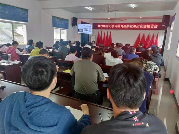 5月11日上午,绩溪县委党史学习教育宣讲团在金沙镇作专题宣讲,全镇60余名党员干部及各村“两委”主要负责同志聆听宣讲。